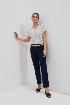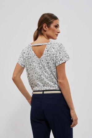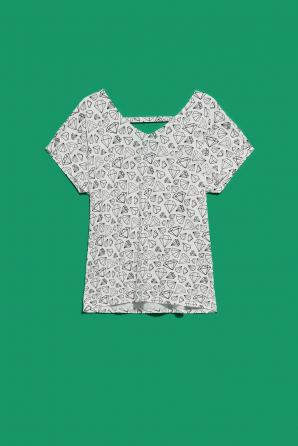 Bílé tričko se zajímavým potiskem. Všude jsou geometrické diamanty vyrobené s tenkou černou linkou. Volný, prostorný střih. Široké, krátké rukávy. Výstřih do V vpředu i vzadu. Výřez s ozdobným vodorovným páskem na zadní straně. Ležérní střih pro maximální pohodlí při nošení. Spodní část košile končila rovně, sahala k bokům. Tato originální halenka je naprostou nutností v šatníku každé ženy.