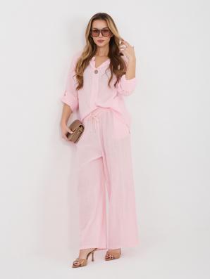 Volná letní halenka s dlouhým rukávem a s ozdobným knoflíkem ve světle růžové barvě
