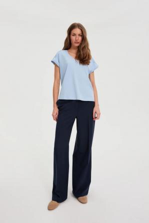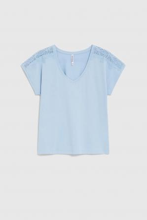 Tato halenka ze 100% BAVLNY ve světle modrém odstínu je ideální pro ženy, které si cení pohodlí a stylu. Jemná a hebká bavlna zajišťuje příjemný pocit po celý den, zatímco krajková vsadka decentně zdůrazňuje ženský nádech. Volný střih, krátké rukávy a výstřih do V zajišťují perfektní padnutí a naprosté pohodlí i v těch nejaktivnějších dnech. Hladká tkanina umožňuje snadné sladění s různými outfity, zatímco spuštěná ramena dodávají halence lehký a módní nádech. Tato halenka je ideální do kanceláře, na setkání s přáteli nebo na procházky po městě. Vypadá perfektně v kombinaci s klasickými džínami, elegantní sukní nebo pod sakem. Tento kousek je ideální pro ty, které hledají všestranný a pohodlný základní kousek šatníku, který kombinuje ležérní pohodlí s ženským nádechem.