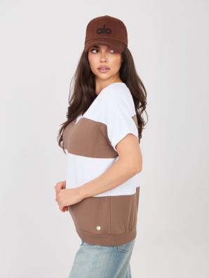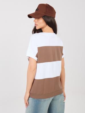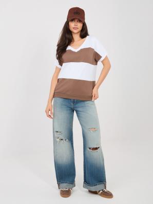 Pruhovaná bavlněná halenka s výstřihem do V v barvách: bílá a hnědá