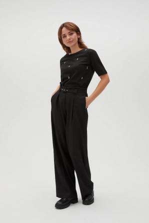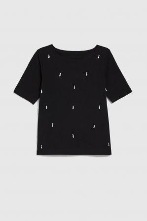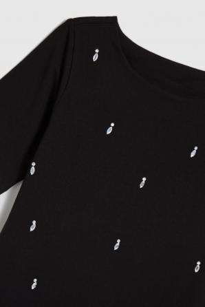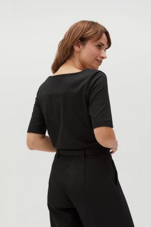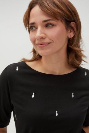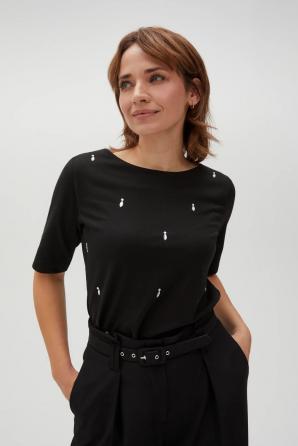 95% BAVLNA, 5% ELASTAN Černá halenka je perfektní volbou pro každou ženu, která si cení elegance a pohodlí. Vyrobeno z vysoce kvalitní bavlny, hladké a jemné na dotek. Dodatečně zdobené jemnými zirkony, které dodávají halence jemnost a svěžest. Krátké rukávy a vypasovaný střih zdůrazňují ženskou siluetu a kulatý výstřih dodává halence nadčasový charakter Tato halenka je vhodná pro mnoho různých příležitostí, jak pro každodenní, tak pro formálnější příležitosti. Skvěle se bude hodit k džínům, sukni nebo pod bundu či svetr. Díky svému univerzálnímu designu se bude hodit k mnoha šatníkům a vždy vytvoří stylový vzhled.