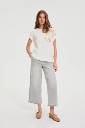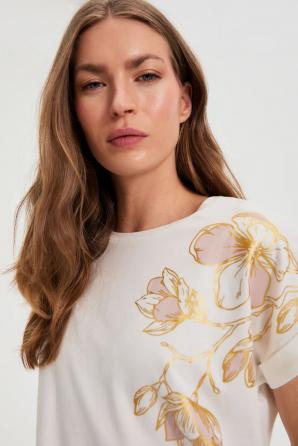 95% BAVLNA, 5% ELASTAN Tato krémová halenka je ideální pro ženy, které si cení pohodlí a volnosti pohybu. Její hladký střih s krátkým rukávem, volný střih a kulatý výstřih decentně lichotí postavě a zároveň poskytuje lehký pocit i v těch nejrušnějších dnech. Decentní potisk dodává halence charakter, zatímco přírodní, měkká bavlna zajišťuje celodenní pohodlí. Všestranný ecru odstín dělá z této halenky perfektní doplněk k mnoha kouskům šatníku. Ideální pro každodenní výzvy v práci, schůzku s přáteli nebo spontánní procházku. Vypadá skvěle samostatně s vašimi oblíbenými džínami, ale dobře se hodí i ke klasickému saku nebo sukni. Tato halenka kombinuje ležérní uvolněnost s ženským, moderním stylem – vždy módní, vždy pohodlná.