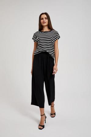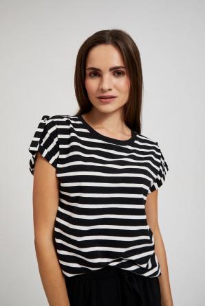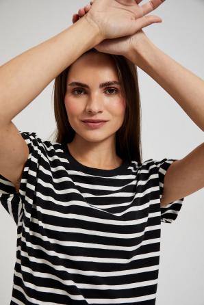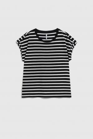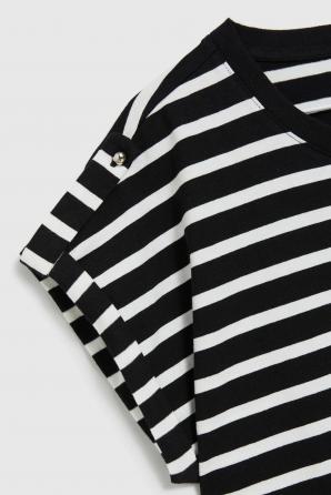 95% BAVLNA 5% ELASTAN Bavlněné tričko v barvě s dominantním pruhovaným vzorem. Volný střih se spadlými rameny. Výstřih je kulatý a rukávy jsou krátké. Toto tričko je ideální pro letní dny a neformální setkání s přáteli. Skvěle se hodí k džínám, šortkám nebo sukni. Může být skvělým doplňkem vašeho letního šatníku, který dodá každému outfitu lehkost a svobodu.