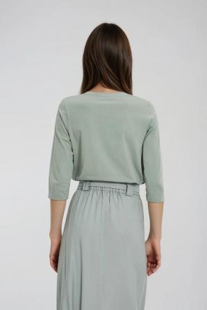 95% BAVLNA, 5% ELASTAN Tato halenka v olivově zbarvené barvě je ideální pro ženy, které si cení pohodlí a nenucenosti ve svém každodenním stylu. Hladká bavlněná tkanina je příjemná na dotek, zatímco decentní potisk dodává lehkost a módní nádech. Volný střih s tříčtvrtečními rukávy a kulatým výstřihem zajišťuje perfektní padnutí, zdůrazňuje přirozenou ženskost a umožňuje naprostou volnost pohybu – ať už vás den zavede kamkoli. Tato halenka je ideální jak pro nošení do kanceláře, tak na procházky či schůzky s přáteli. V kombinaci s klasickými džínami, elegantními kalhotami nebo sukní dodá vašemu outfitu decentní, uvolněný a moderní nádech. Hodí se skvěle samostatně nebo pod sako a vytváří tak všestranný, ležérní vzhled s nádechem městské elegance. Je to volba, která vás inspiruje ke každodennímu spojení pohodlí se stylem.