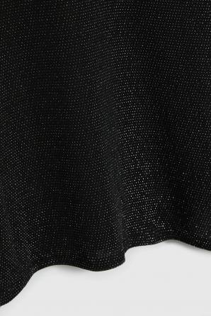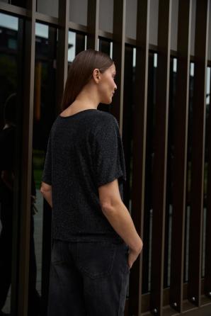 50% POLYAMID, 30% VISKÓZA, 15% METALICKÁ NIT, 5% ELASTAN Tato černá halenka s krátkým rukávem je ideální pro ženy, které si cení moderního stylu a pohodlí. Hladká, nevzorovaná látka s jemným leskem. Volný střih se spuštěnými rameny umožňuje volný pohyb. Halenku lze nosit dvěma způsoby – vpředu nebo vzadu, v závislosti na preferovaném výstřihu. Tato halenka je ideální pro společenské setkání, večerní zábavu nebo ležérní dny v práci. Perfektně se hodí ke klasickým džínům, elegantním látkovým kalhotám a pouzdrovým sukním.