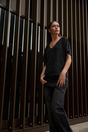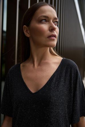 50% POLYAMID, 30% VISKÓZA, 15% METALICKÁ NIT, 5% ELASTAN Tato černá halenka s krátkým rukávem je ideální pro ženy, které si cení moderního stylu a pohodlí. Hladká, nevzorovaná látka s jemným leskem. Volný střih se spuštěnými rameny umožňuje volný pohyb. Halenku lze nosit dvěma způsoby – vpředu nebo vzadu, v závislosti na preferovaném výstřihu. Tato halenka je ideální pro společenské setkání, večerní zábavu nebo ležérní dny v práci. Perfektně se hodí ke klasickým džínům, elegantním látkovým kalhotám a pouzdrovým sukním.