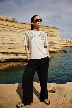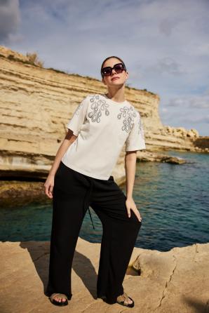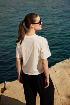 Tato krémová halenka ze 100% BAVLNY je ideální pro ženy, které kombinují pohodlí s moderním stylem. Hladká bavlněná tkanina je příjemná na dotek a umožňuje volný pohyb po celý den. Decentní potisk zdůrazňuje její módní charakter, zatímco volný střih a kulatý výstřih dodávají halence lehký a ženský vzhled. Krátké rukávy jsou ideální pro teplejší dny nebo vrstvené outfity. Tato krémová halenka je ideální do práce, na procházku nebo na setkání s přáteli. Lze ji kombinovat s elegantními kalhotami, midi sukní, klasickými džínami nebo sakem. Díky své všestrannosti vám umožní vytvářet ležérní, každodenní i elegantnější outfity. Je pohodlným základem pro různé outfity, zdůrazňuje individuální styl a pohodlí v každé situaci.