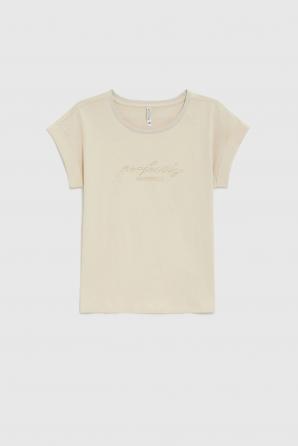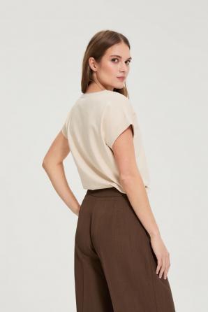 95% BAVLNA, 5% ELASTAN Tato béžová halenka s potiskem je synonymem pohodlí a moderního stylu. Jemná, hebká látka je příjemná na dotek a jednoduchý střih vám umožní cítit se pohodlně po celý den. Krátké rukávy dodávají nádech lehkosti, zatímco minimalistický potisk zdůrazňuje individuální charakter stylu. Béžová barva se dobře hodí k mnoha doplňkům a vnáší do vašeho každodenního šatníku svěžest a decentní eleganci. Ideální na setkání s přáteli, do práce nebo na víkendovou procházku. Perfektně se hodí k džínům, lehkým kalhotám, ležérní sukni nebo pod klasické sako. Tato halenka se dobře hodí k ležérním outfitům i jako základ pro elegantnější outfity. Pohodlná, stylová a všestranná – pro ženy, které si cení přirozeného vzhledu a módního každodenního stylu.