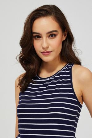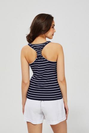 Tmavě modrý top s potiskem bílých pruhů. Široké pásky bez úpravy. Kulatý výstřih Boxerka s odhalenými rameny. Na zadní straně dekorativní vazba. Top bude fungovat v duetu s bílými šortkami a sportovní obuví