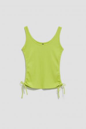 Dámský top. Kulatý výstřih. Široká ramínka. Vyrobeno z žebrovaného materiálu. Na bocích lemy a šňůrky. Vypasovaný střih. skvěle se hodí ke šortkám a kalhotám. Ideální na léto.