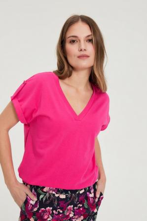 95% BAVLNA, 5% ELASTAN Tato fuchsiová halenka je ideální pro ženy, které si cení pohodlí a svěžesti v každodenním stylingu. Hladká bavlněná tkanina zajišťuje lehkost a prodyšnost i během těch nejaktivnějších dnů. Výstřih do V s ramenními náramky decentně zdůrazňuje ženskost, zatímco volný střih zaručuje volnost pohybu a celodenní pohodlí. Zářivá růžová barva dodá energii každému outfitu a je ideální do práce, na schůzku s přáteli nebo na procházku po městě. Tato ležérní halenka se perfektně hodí k vašim oblíbeným džínům, chino kalhotám nebo pouzdrové sukni. V kombinaci se sakem vytvoří stylový vzhled do kanceláře a s kraťasy nebo legínami ležérní outfit na každý den. Díky své všestrannosti a praktickému designu je tento kousek nezbytnou součástí šatníku každé moderní ženy a kombinuje pohodlí, ženský styl a snadnost v každé situaci.