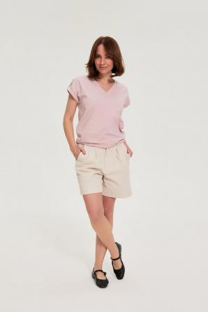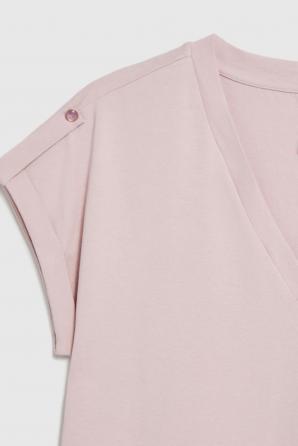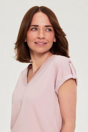 95% BAVLNA, 5% ELASTAN Tato decentní růžová halenka je ideální pro ženy, které si každý den cení pohodlí a volnosti pohybu. Lehká a na dotek měkká bavlna umožňuje pokožce dýchat, zatímco volný střih krásně zdůrazňuje přirozenou siluetu. Výstřih do V dodává kousku jemnou ženskost, zatímco nárameníky na ramenou dodávají módní nádech, který tento kousek odlišuje od klasických triček. Hladká struktura a absence vzorů umožňují naprostou stylistickou svobodu a vytvářejí základ pro mnoho každodenních outfitů. Tato halenka je ideální na pracovní den, schůzky s přáteli, procházku nebo víkendové pobyty ve městě. Perfektně se hodí k džínům, lněným kalhotám nebo sukni a v chladnějších dnech ji můžete zkombinovat s lehkou bundou nebo kardiganem. Všestranný a ležérní charakter střihu z ní dělá skvělou volbu pro ženy, které hledají stylový, praktický a ležérní doplněk svého každodenního šatníku.