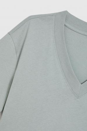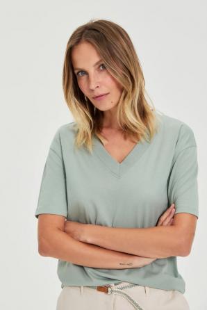 100% BAVLNA Tato klasická halenka v olivové barvě je nezbytností v šatníku každé ženy. Měkká, příjemná bavlna na dotek zajišťuje celodenní pohodlí, zatímco volný střih a výstřih do V dodávají lehkost a lichotí ženské siluetě. Jednoduchý a hladký střih ji činí univerzální k různým outfitům, zatímco krátké rukávy zaručují volnost pohybu a jsou ideální pro každé roční období. Je to perfektní volba do práce, na kávu s kamarádkou nebo na víkendové procházky po městě. Vypadá skvěle s džínami, látkovými kalhotami, pod sakem nebo v kombinaci se sukní – pro elegantní i ležérní outfity. Díky svému všestrannému charakteru a klasickému stylu je ideální pro každou příležitost, pro ženy, které si cení pohodlí a přirozeného, ??ležérního vzhledu.