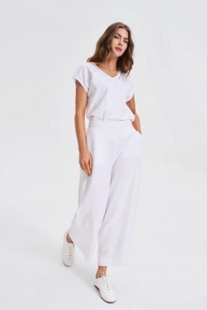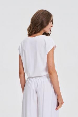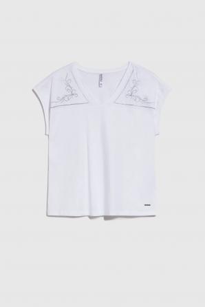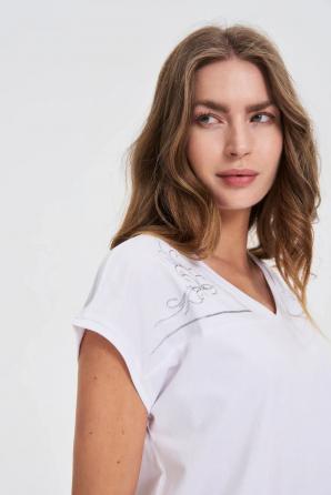 100% BAVLNA Bílá dámská halenka je skvělou nabídkou pro milovnice klasické elegance a univerzálních řešení. Jemný, obohacený o jemnou aplikaci. Volný střih zajišťuje volnost pohybu a pohodlí a výstřih do V krásně zvýrazňuje dekolt. Halenka je ideální na letní procházky, venčení s přáteli nebo každodenní aktivity. Ideální pro nošení s džínami, kraťasy, midi sukní nebo pod sako – sportovní i ležérní. Perfektní volba pro teplý šatník, která zdůrazňuje individuální styl a nadčasovou ženskost.
