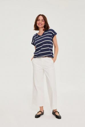 95% BAVLNA, 5% ELASTAN Tato tmavě modrobílá pruhovaná halenka kombinuje ležérní styl s ženským nádechem. Lehká a vzdušná bavlna zajišťuje celodenní pohodlí, zatímco jemný výstřih do V decentně zdůrazňuje krk. Volný střih zaručuje pohodlí, zatímco ozdobné nárameníky a manžety dodávají módní nádech. Bez rukávů a z měkké látky je ideální jak pro dynamický den, tak pro klidné chvíle. Tato halenka se dobře hodí ke klasickým džínům, elegantní sukni nebo lehkému saku. Je to perfektní volba do práce, na schůzku s přítelem nebo na večerní procházku městem. Modré pruhy dodávají svěží nádech a všestranný střih umožňuje širokou škálu outfitů. Pohodlná, stylová a připravená na každodenní výzvy – tato halenka je nedílnou součástí moderního šatníku.