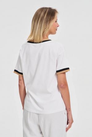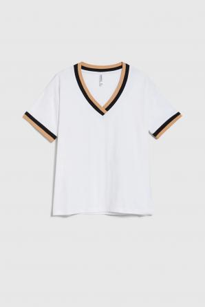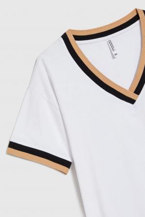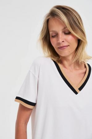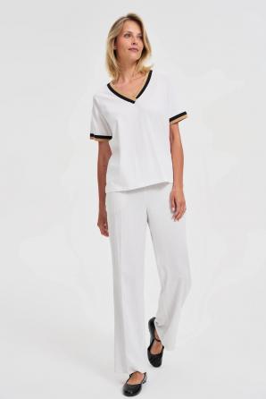 95% BAVLNA, 5% ELASTAN Toto bílé tričko s volným střihem je ideální pro milovnice minimalistické elegance. Hladký, nevzorovaný povrch dokonale zdůrazňuje jeho všestranný charakter, zatímco krátké rukávy zajišťují pohodlné každodenní nošení. Dekorativní výstřih do V a decentní ozdobná páska dodávají tomuto kousku trička jedinečný nádech, který ho odlišuje od klasických triček. Přírodní bavlna zaručuje prodyšnost a příjemně hebký pocit na pokožce. Je to perfektní volba pro schůzky s přáteli, do práce nebo na procházku v teplejších dnech. Perfektně se hodí ke klasickým džínům, pouzdrové sukni, látkovým kraťasům nebo elegantním cigaretovým kalhotám. Je perfektním základem pro ležérní a poloformální outfity. Dámská bílá halenka je nezbytným kouskem každého šatníku a umožňuje vám vytvořit nespočet módních kombinací.