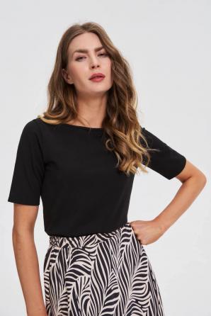 95% BAVLNA, 5% ELASTAN Tato černá halenka s hladkou texturou je nadčasovou volbou pro milovnice minimalistického stylu. Přiléhavý střih lichotí postavě, zatímco výstřih ve tvaru lodičky dodává decentní eleganci. Krátké rukávy zajišťují pohodlí v teplejších dnech a zároveň umožňují volnost pohybu. Přírodní, měkká bavlna zaručuje celodenní pohodlí a prodyšnost, díky čemuž je halenka příjemná na dotek a šetrná k pokožce. Ideální pro každodenní nošení, do práce i na schůzky s přáteli. Perfektně se hodí ke klasickým džínům, pouzdrové sukni a elegantním cigaretovým kalhotám. Hodí se také jako základní vrstva pod sako nebo kardigan.