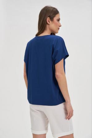 95% BAVLNA, 5% ELASTAN Tmavě modrá halenka s krátkým rukávem je skvělou volbou pro ženy, které si cení pohodlí a moderního stylu. Volný střih s padlými rameny decentně zdůrazňuje postavu a zároveň poskytuje volnost pohybu. Kulatý výstřih dodává halence noblesu a efektní potisk je módním akcentem na hladkém materiálu. Přírodní bavlna zaručuje prodyšnost a pohodlí při celodenním nošení. Ideální na schůzky s přáteli, letní procházky nebo do města. Skvěle se hodí k džínům, kraťasům nebo splývavé sukni.
