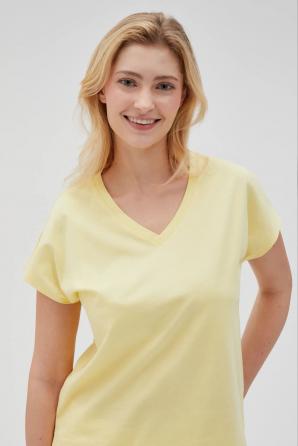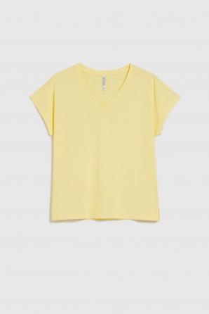 100% BAVLNA Žlutá halenka, bez vzoru, z hladké bavlny. Model s výstřihem do V, který poskytuje volný a pohodlný střih. Ideální pro letní dny. Ideální volba pro neformální schůzky nebo večery s přáteli. V každodenním stylingu se perfektně hodí k džínám, kraťasům a sukni.
