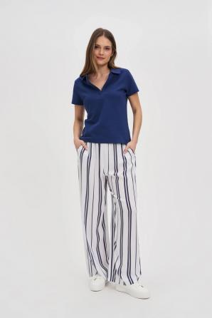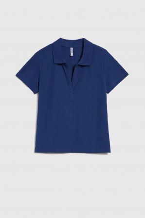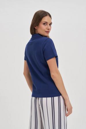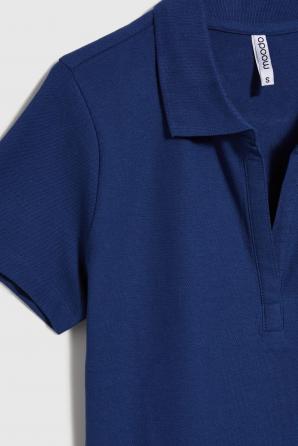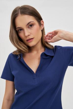 100% BAVLNA Dámská halenka v tmavě modré barvě, bez vzoru, z hladké bavlny. Má límec a krátké rukávy, což zajišťuje pohodlné nošení. Produkt se přizpůsobí siluetě a zdůrazní její přednosti. Ideální pro každodenní použití, pro ležérní styling. Hodí se k džínám, sukním i pod sako, čímž vytváří univerzální a módní kombinace.