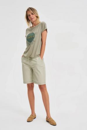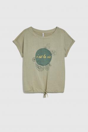 Halenka olivové barvy z hladké bavlny s potiskem. Má atraktivní zavazování ve spodní části, ohrnuté rukávy a kulatý výstřih. Volný střih a spadlá ramena zajišťují pohodlí a volnost pohybu. Halenka se bude skvěle hodit na letní setkání s přáteli nebo odpočinkový den na pláži. Skvěle bude vypadat jak k džínům a teniskám, tak k letním sukním a sandálům. Jedná se o módní a pohodlný kousek šatníku, který dodá svěžest a styl stylingu každé ženy.