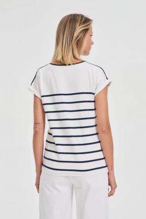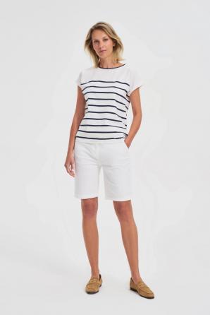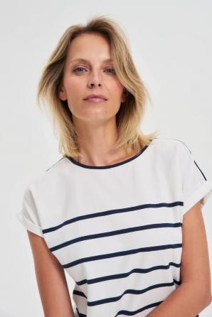 95% BAVLNA, 5% ELASTAN Bílá proužkovaná halenka z měkké bavlny. Je ideální pro letní dny, poskytuje pohodlí a komfort nošení. Vyhrnuté rukávy a volný střih dodávají halence lehkost a dívčí šarm. Krátký rukáv s kulatým výstřihem, ideální k džínům, šortkám a sukni. Produkt je vhodný pro letní schůzky a každodenní styling.