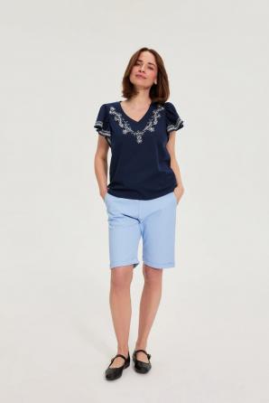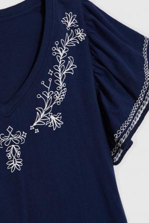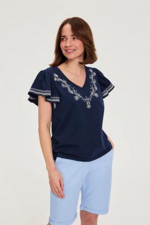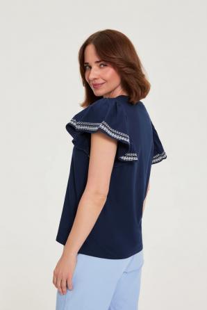 Tato tmavě modrá halenka ze 100% BAVLNY je ideální pro ženy, které si cení pohodlí a decentního každodenního stylu. Hladká a měkká bavlna jemně obepíná siluetu, zatímco přiléhavý výstřih do V zdůrazňuje ženskost. Volány a jedinečný potisk dodávají halence charakter a modernost, takže se odlišíte od davu, aniž byste to přehnali. Ideální do práce, na neformální procházku nebo na setkání s přáteli. Tato halenka se krásně hodí ke klasickým džínům, pouzdrové sukni nebo pod sako a vytvoří tak stylové a pohodlné outfity pro různé příležitosti. Díky svému všestrannému střihu se hodí jak k ležérnímu, tak i k elegantnějšímu outfitu. Je to nezbytný kousek v šatníku každé ženy, který kombinuje funkčnost s módním vzhledem.