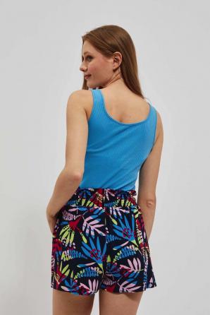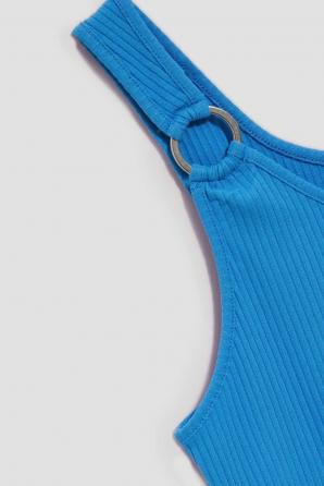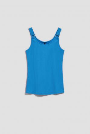95% POLYESTER 5% ELASTAN Dámský top, v originální modré barvě. Kulatý výstřih. Ozdobné kovové kroužky všité do ramínek. Vyrobeno z žebrovaného úpletu, měkké a pohodlné na nošení. Vypasovaný střih, zdůrazňující siluetu. Ideální pro letní dny, každodenní styling a výlety na pláž.